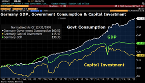 مرحبا من ألمانيا – حيث القطاع العام هو الذي يزدهور بشكل رئيسي. في الربع الثالث، ارتفع استهلاك الحكومة بنسبة 0.8٪ على أساس سنوي، بينما انخفض الاستهلاك الخاص بنسبة 0.3٪. ارتفع الاستثمار المؤسسي بنسبة 0.3٪، بعد أن تراجع بنسبة 1.1٪ في الربع الثاني. منذ عام 2000، زاد الإنفاق الحكومي بنسبة >60٪، بينما نما الاستثمار الرأسمالي بنسبة 15٪ فقط. ونتيجة لذلك، ارتفع الناتج المحلي الإجمالي لألمانيا بنسبة تزيد قليلا عن 30٪.