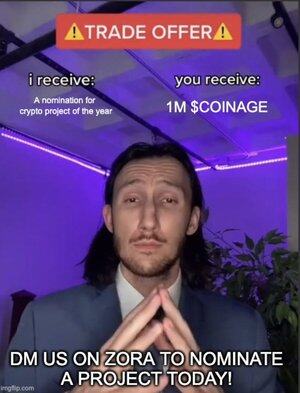 ترشيحات مشروع العملات الرقمية للعام ™️ تزداد! 1) جمع مليون عملة 2) أرسل لنا مشروعا على @zora 3) الحصول على التعرض من خلال مقابلات أمام ثلاثة ملايين من كبار المستثمرين 4) استعد للتصويت على أي من أفضل 16 مشروعا يفوز