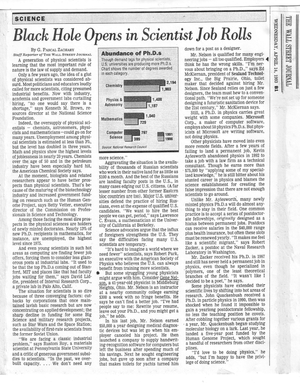 جديد: قارئ يشارك مقالا من صحيفة وول ستريت جورنال عام 1993 حول الصعوبات التي كان يواجهها العلماء في الحصول على وظائف. يكتب: "كان حاملي الدكتوراه في العلوم والتكنولوجيا والهندسة والرياضيات الأمريكيون أول مجموعة مهنية تعرضت لتأشيرة H-1 الغامضة التي أنشئت بموجب تعديل إيلبرغ لعام 1976. لا تزال الكليات والجامعات تمتلك القدرة على توظيف أعداد غير محدودة من الأساتذة والباحثين من أصول أجنبية. الناس من الهند ممثلون بشكل مفرط." نحن في مرحلة جديدة من حرب طويلة جدا.