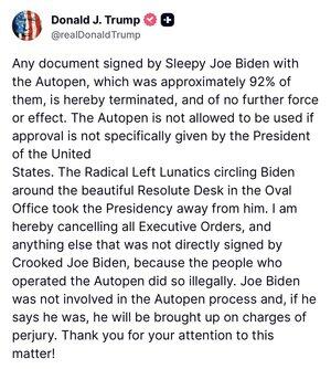 صرح الرئيس الأمريكي دونالد ج. ترامب في منشور سابق على تروث سوشيال أنه سيقوم "بإنهاء" أي وثيقة موقعة من الرئيس جو بايدن باستخدام القلم الآلي، والذي يدعي أنه يمثل حوالي 92٪ من جميع أوامره التنفيذية. بينما لا يبدو أن هناك أساسا قانونيا لهذا التصريح أو التصرف من قبل الرئيس ترامب، لا يوجد ما يمنعه من إلغاء أوامر بايدن التنفيذية من خلال أوامره التنفيذية الخاصة، كما كان الحال مع جميع الرؤساء السابقين.