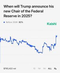 خبر للتو: 🇺🇸 احتمالية إعلان الرئيس ترامب عن رئيسه الجديد للاحتياطي الفيدرالي هذا العام ترتفع إلى 82٪، حسب المتداولين على كالشي.