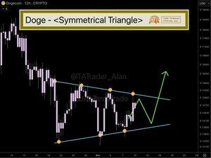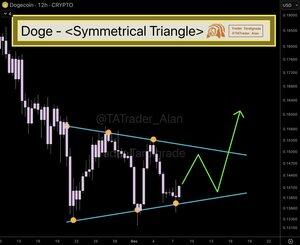 #Dogecoin vytvořil symetrický trojúhelník, což může naznačovat obrácený vzor dna v současném sestupném trendu.