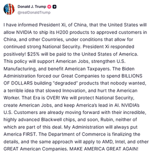 Trump potvrzuje, že povolí dodávky H200 do Číny, a Si "reagoval pozitivně." Uvádí, že "stejný přístup platí pro AMD, Intel a další americké firmy."