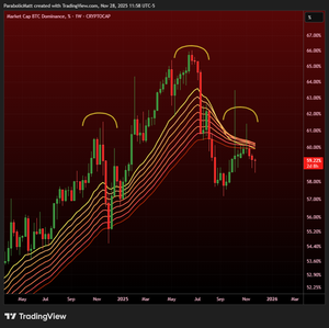 #BTC Dominance Weekly se blíží k medvědímu přehození pásky poprvé od února 2021: