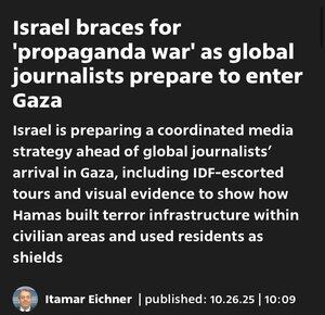 🔴 ZPRÁVA | Podle izraelského YNET připravuje Izrael koordinovanou mediální kampaň před vstupem zahraničních novinářů do Gazy, poprvé po dvou letech genocidního zabíjení a ničení. Úředníci říkají, že cílem je kontrolovat příběh, protože reportéři dokumentují destrukci z první ruky.