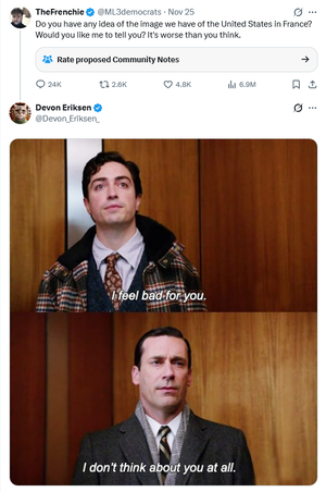 Máte představu o tom, jaký obraz máme o Spojených státech ve Francii? Chceš, abych ti to řekl? Je to horší, než si myslíš.