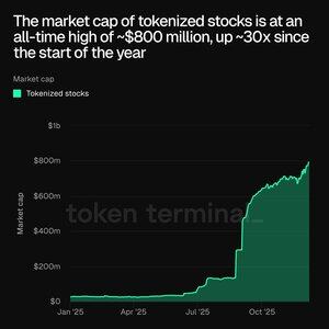 Tokenizované akcie rychle rostou, tržní kapitalizace dosáhla ~800 milionů dolarů, což je ~30násobný nárůst oproti lednu.