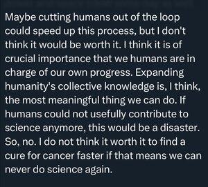 Jeden z panelistů se mě zeptal, zda bych opravdu raději měl radost z vědecké práce než hledání léku na rakovinu a umožnění nesmrtelnosti. Odpověděl jsem, že rakovinu nakonec vyléčíme a pravděpodobně si jednou budeme moci zvolit nesmrtelnost. Věda už s lidmi v čele dělá velký pokrok. Jednou dostaneme i fúzní energii a cestování do vesmíru. Možná by vyřazení lidí z dění urychlilo tento proces, ale nemyslím si, že by to stálo za to. Myslím, že je zásadní, abychom my lidé byli zodpovědní za svůj vlastní pokrok. Rozšiřování kolektivního lidského poznání je podle mě to nejvýznamnější, co můžeme udělat. Pokud lidé už nebudou schopni užitečně přispívat vědě, bude to katastrofa. Takže ne. Nemyslím si, že stojí za to hledat lék na rakovinu rychleji, pokud to znamená, že už nikdy nebudeme moci dělat vědu.