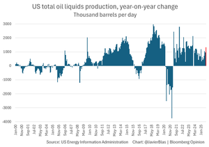 GRAF DNE: Zatím růst produkce ropy v USA (celková kapalná hmota, včetně ropy, kondenzátů a NGL) nezpomaluje. Ve skutečnosti je to naopak, poslední měsíce zaznamenaly zrychlení meziročního růstu na >1 milion b/d.