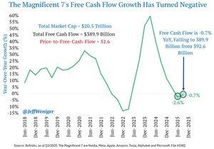 Poměr ceny k volnému peněžnímu toku Mag 7 je 52,6. Ale jejich volný peněžní tok je meziročně -0,7 %. Říkají nám, že kapitálové výdaje se v roce 2026 také zrychlí, takže logika říká, že tento graf může zůstat v dohledné době záporný. Trh to v roce 2022 neměl rád a mně se to nelíbí ani teď.