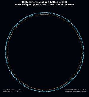 V vysokorozměrné kouli téměř veškerý objem žije v tenké skořápce blízko hranice... Stačí trochu zmenšit poloměr a vyhodíte téměř všechno, takže náhodné body vůbec nesedí uprostřed, ale jsou rozmačkané do mikroskopické svatozáře na okraji.