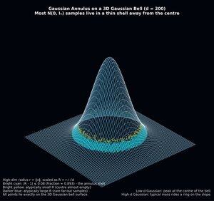 Vysokorozměrný Gaussovský systém není útulný zvon s hmotou přitulenou k vrcholu, je v podstatě prázdný uprostřed, přičemž téměř veškerá pravděpodobnost žije v tenkém halo na svahu ve vzdálenosti přibližně "druhé odmocniny z rozměru" od počátku.