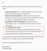 Na starší účty Alby se sdílenou peněženkou vytvořenou v roce 2023 nebo dříve se bude vztahovat poplatek za nečinnost, pokud po dobu 12 po sobě jdoucích měsíců nedojde k žádné aktivitě na účtu.