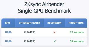 Operační systém ZKsync (naše nové prováděcí prostředí zkEVM), poháněný Airbenderem, dokazuje, že bloky Ethereum jsou end-to-end za méně než 35 sekund na jediném GPU.