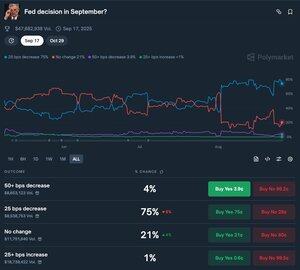 Domnívám se, že dny vedoucí k příštímu zasedání FOMC 17. září budou naplněny větší volatilitou. Čím více budeme od nynějška do 17. září odčerpávat atomovkami, tím více budeme pumpovat, pokud bude 17. září rozhodnuto o snížení sazeb. Ale pokud nedojde ke snížení sazeb, pak GG půjdeme dolů mnohem více, předpokládám. Ale sledujeme Polymarket a vše je v pořádku, říká 75% šanci na snížení o 25 bazických bodů.