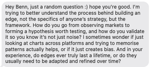 Mám tuto otázku ohledně procesu, který dnes stojí za budováním edge. Náš proces je velmi specifický pro deriváty a nelze jej zobecnit. Mohli by se prosím přidat další investiční profesionálové? Děkuji =)