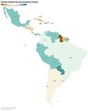 Procento katolíků podle země v Latinské Americe. Na rozdíl od všeobecného přesvědčení není moderní Latinská Amerika příliš katolická. To je způsobeno dramatickým nárůstem počtu Latinoameričanů, kteří konvertují buď k protestantismu, nebo k ateismu.