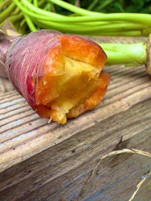 Fialová vnější strana -> oranžová vrstva -> žluté jádro