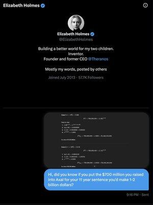Ahoj @ElizabethHolmes, Pokud byste vložili peníze, které jste získali, do Axalu na čas, který strávíte pryč, vydělali byste 1-2 miliardy dolarů?