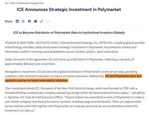 JUST IN: 🇺🇸 NYSE bude spolupracovat se společností Polymarket na budoucích iniciativách tokenizace.