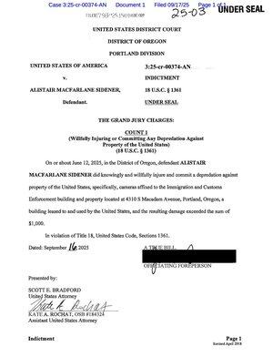 Federální obvinění proti Alistairu MacFarlane Sidenerovi zatím nejsou známa, ale byl odsouzen na státní úrovni za svou roli v lednovém útoku na inauguraci Antify v centru Portlandu. Byl odsouzen pouze k jednomu dni ve vězení.