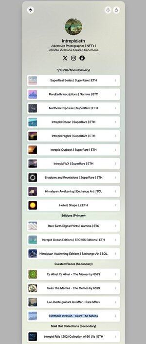 12/50 Od května 2021 je úžasné vidět významnou úroveň podpory mého fotografického umění. Moje dva výstřely genesis byly vyraženy 21. května a prodány legendě @caktux . Poté jsem měl štěstí, že kolekce Intrepid Falls byla dobře přijata, a v srpnu 2021 jsem prodal všech 66 záběrů 37 sběratelům, přičemž vzácný zmrzlý pád dosáhl 10Ξ na sekundární. Seznam sběratelů je příliš dlouhý na to, abychom zde poděkovali; Ale vědí, kdo jsou a vždy budou mít mé uznání.