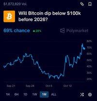 JUST IN: Pravděpodobnost, že Bitcoin letos klesne pod 100 000 USD, podle Polymarketu vzroste na 69 %.