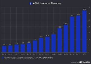 $ASML za poslední 4 čtvrtletí přineslo tržby ve výši 32,2 miliardy dolarů, což je nárůst oproti tržbám ve výši 14 miliard dolarů v roce 2020
