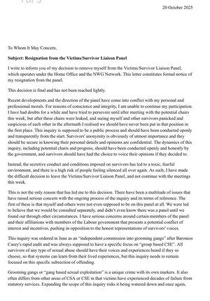 Ode dneška otevřeně rezignuji na členství v panelu pro vyšetřování přeživších znásilňovacích gangů kvůli vážným obavám o jejich schopnost dobrat se pravdy a zacházení s přeživšími