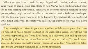 "Váš smartphone uspokojí každý váš rozmar... Žádný přítel není tak zábavný jako video, které si můžete stáhnout na telefonu. Žádná holka není tak žhavá jako nekonečné přehlídkové molo ve vaší kapse. Můžete se s někým setkat na pizzu, ale mávnutím prstu dorazí až k vašim dveřím."