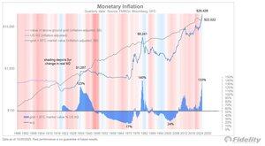 Jedním z důvodů, proč uvažovat o zvonění na zlatý zvon, je skutečnost, že pokud je zlato hrou na fiskální dominanci USA, dalo by se tvrdit, že tato série je nyní dokončena.  Níže uvedený graf ukazuje americký M2 vůči nadzemní hodnotě zlata plus tržní hodnotě bitcoinu.  V době měnové inflace má tržní hodnota tendenci stoupat alespoň na hodnotu M2, ne-li více.  Zlato a bitcoin mají hodnotu 29 bilionů dolarů a jsou nyní na 133 % M2, což je velmi blízko vrcholu z roku 1980.  Je to něco, co je třeba mít na paměti po stratosférickém běhu zlata.