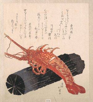 Humr na kousku dřevěného uhlí. Umělec: Totoya Hokkei. Období: Období Edo, 19. století. Kultura: Japonsko. Médium: dřevoryt surimono; tuš a barva na papíře. Rozměry: 20,8 x 18,4 cm. Sbírka: Metropolitní muzeum umění, New York.