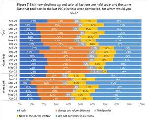 🔸️Pokud by se parlamentní volby konaly "dnes" (za účasti všech sil), mezi pravděpodobnými voliči: 44% by hlasovalo pro Hamás, 30% pro Fatah, 10% pro ostatní, 16% nerozhodnutých.