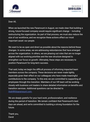 Novinka: Po akvizici společnosti The Free Press za 150 milionů dolarů Paramount oficiálně propouští, a to i v CBS. Generální ředitel David Ellison (syn druhého nejbohatšího člověka na Zemi) v interním memorandu říká, že postupně ruší role, "které již nejsou v souladu s našimi vyvíjejícími se prioritami".