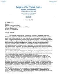 Dopis od republikána Jima Jordana Stanfordskému centru pro kybernetickou politiku požadující informace týkající se zahraničního cenzurního schématu: "Tento dopis slouží jako formální žádost o zachování všech stávajících a budoucích záznamů a materiálů týkajících se témat řešených v tomto dopise." 1/2