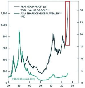 Ve stejné době celková tržní hodnota zlata jako % globálního bohatství dosáhla ~4 %, což je nejvyšší hodnota od 90. let.
