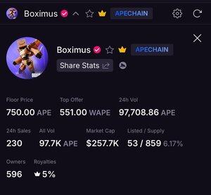 Boximus od @yugalabs se obchoduje na 750 APE, téměř 2x od posledního příspěvku.