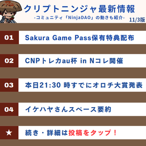 Crypto Ninja Nejnovější vydání 11/3 ⏤⏤⏤⏤⏤⏤⏤⏤⏤⏤⏤⏤⏤⏤⏤⏤⏤ (1) Sakura Game Pass bude distribuován jako bonus (2) Konala se sbírka CNP trading card au Cup in N (3) Dnes ve 21:30 již byla vyhlášena Velká cena Orochi (4) Shrnutí prostoru Ikehaya-san (5) CNN862 vyhrála nabídku za 0,02 ETH Níže jsou uvedeny různé zdroje 🔽 informací いつも💖🔁ありがとうございます!!