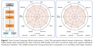 Trénují dva modely, LoopLM s parametry 1,4B a 2,6B na 7,7T tokenech, které odpovídají výkonu 4B a 8B standardních transformátorů téměř ve všech benchmarcích a dosahují 2-3× zlepšení účinnosti parametrů.