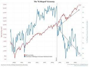 Modrá je spotřebitelský sentiment, jde přímo dolů a je blízko minima za několik desetiletí. Inflace (cenová dostupnost) tlačí tento ukazatel níže. Snížení sazeb bolí.
