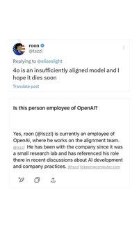Zaměstnanec týmu OpenAI (Roon) veřejně prohlásil, že 4o je "nedostatečně sladěno" a "doufá, že brzy zemře".
