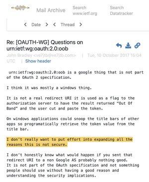 příspěvek je od spoluautora mnoha specifikací OAuth, včetně RFC 8252, dotyčné specifikace OAuth