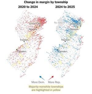 Silně hispánské oblasti, které se v roce 2025 posunuly nejvíce doleva, byly prakticky zrcadlovým obrazem míst, která se v roce 2024 vychýlila nejvíce doprava.