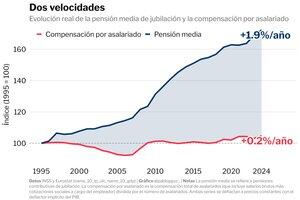Ohromující graf ukazuje, že od roku 1995 vzrostly průměrné španělské důchody o 1,9 %, zatímco průměrné mzdy vzrostly o 0,2 %.