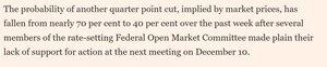 FT o pravděpodobnosti prosincového snížení sazeb Federálním rezervním systémem. (Tato pravděpodobnost byla 92 % těsně před posledním oznámením sazeb Fedu 29. října.) #economy #markets #fedralreserve @ft