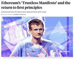 Ve čtvrtek Vitalik Buterin a spoluautoři Yoav Weiss a Marissa Posner zveřejnili The Trustless Manifesto — rozsáhlou výzvu vývojářům k akci