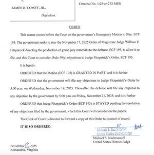 AKTUALIZACE: Soudce Nachmanoff krátce zastavil příkaz, který vyžadoval, aby ministerstvo spravedlnosti předalo materiály velké poroty Comeymu. Místo toho stanovuje rychlý harmonogram pro posouzení odvolání ministerstva spravedlnosti proti rozhodnutí, které by mělo být vyřešeno do příštího týdne.