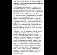 🚨 AKTUÁLNÍ: Předseda Sněmovny reprezentantů Indiany Todd Huston plně podporuje prezidenta Trumpa a snahy o přerozdělení obvodů o vytvoření mapy 9-0: