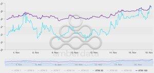 Vidíme prudký nárůst volatility napříč celým spektrem. Krátkodobá volatilita (30denní délka) vzrostla z 41 % na 49 % za pouhé dva týdny a dlouhodobá volatilita (180 dní) se pohybuje téměř souběžně, z 46 % na 49 %.