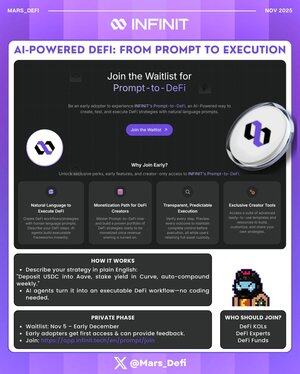 Budoucnost tvorby DeFi strategií přichází brzy s Prompt-to-DeFi od @Infinit_Labs! Představte si, že popisujete svou DeFi strategii prostou angličtinou "Vložte USDC do Aave, stakujte výnos v Curve a každý týden automaticky vydělejte odměny." AI agenti INFINITu převádějí tuto výzvu na spustitelný DeFi workflow bez nutnosti programování. Prompt-to-DeFi si klade za cíl demokratizovat tvorbu DeFi strategií a umožnit komukoli vytvářet složité onchain workflow jen tím, že je popíše. — Dnes jsou vícestupňové DeFi strategie uzamčené za kódem a technickou složitostí. Prompt-to-DeFi tuto bariéru prolomí. Probíhá soukromá fáze, která dává raným uživatelům a tvůrcům strategií první přístup. Během této fáze si INFINIT klade za cíl shromáždit zpětnou vazbu z reálného světa před veřejným nasazením. Doba čekání: 5. listopadu – začátek prosince 🔗: Kdo by se měl přidat? DeFi KOLové: Komunitní lídři získávají raný přístup k tvůrcům, přeměňují nápady na realizovatelné strategie a získávají přístupové kódy pro své následovníky. Odborníci na DeFi: Výzkumníci, analytici a tvůrci protokolů pro testování pracovních postupů a formování vývoje. DeFi fondy: Institucionální a andělští investoři mohou rychleji navrhovat a automatizovat strategie institucionální úrovně. — Pokud se chcete stát součástí první vlny tvůrců strategií poháněných umělou inteligencí, přidejte se ještě dnes na čekací listinu. Pokud by "Prompt-to-Code" změnilo vývojové pracovní postupy, pak "Prompt-to-DeFi" redefinuje budování on-chain strategie. Budoucnost je agentická, budoucnost je NEKONEČNÁ, tak zůstaňte $IN!